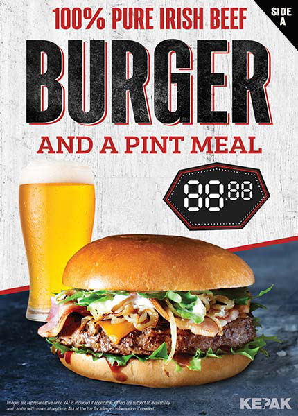 Part of our POS range specifically designed for the pub channel, this A4 menu insert is ideal to promote your meal deals and seasonal specials. With eyecatching Prime Burger imagery and Big Al's Sidekicks range and editable price points for your own adjustment.